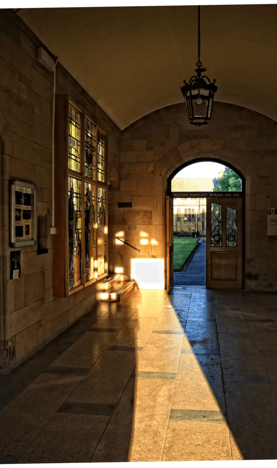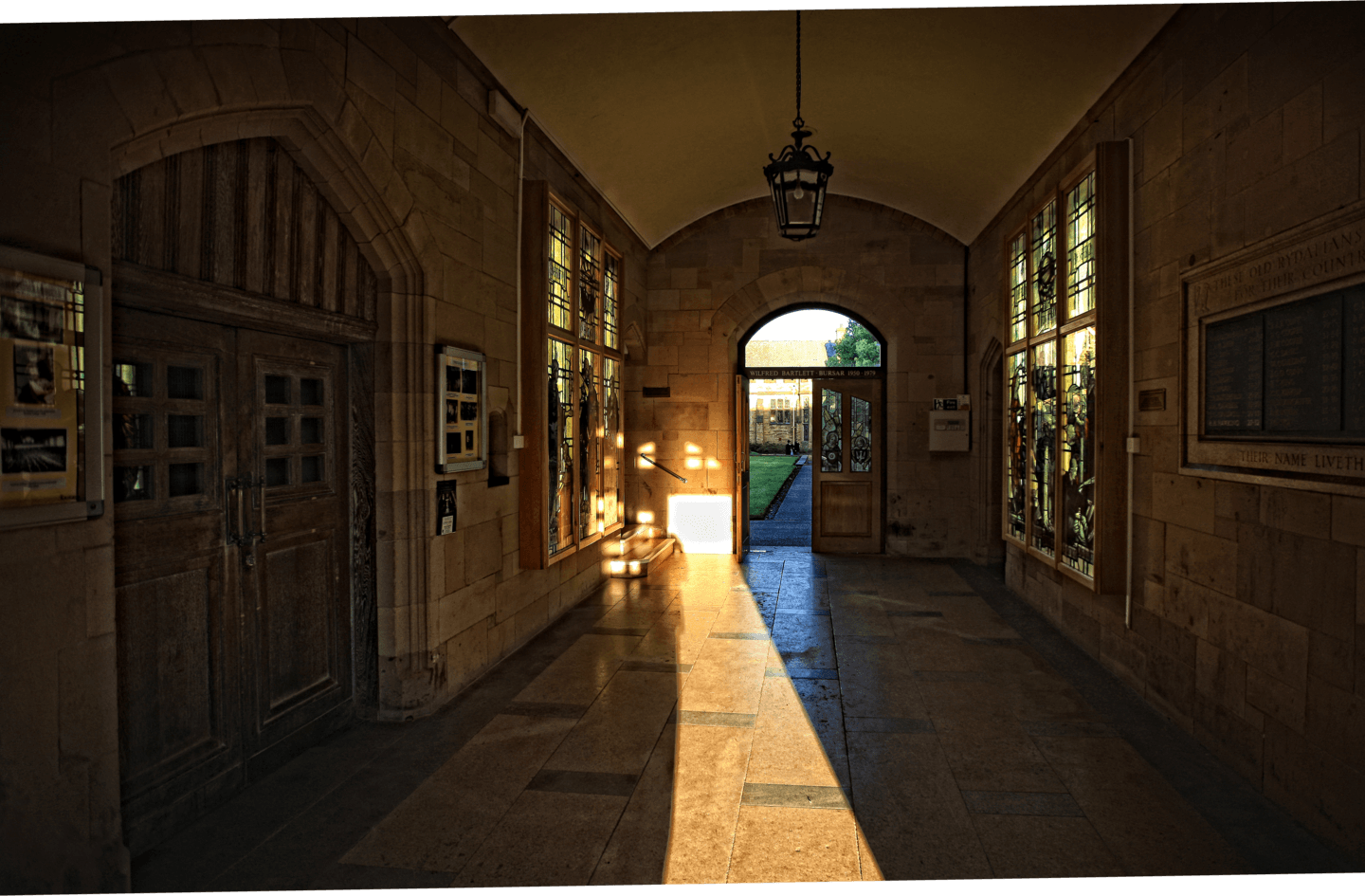 Hubbard describes the Memorial Hall as ‘lighter and more fanciful than the earlier work’. The masonry, he notes, ‘is still of fine quality’. ‘Inside is a coffered ceiling with coloured patterning in the panels.’